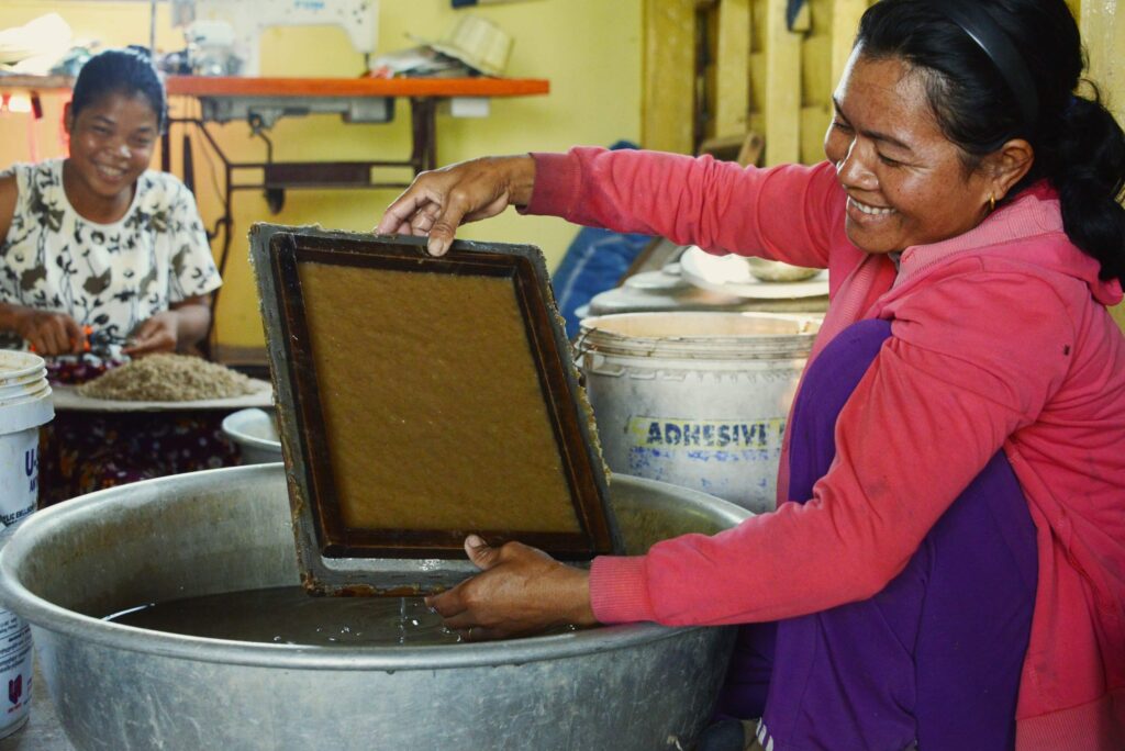 カンボジアで廃棄されていたバナナの茎の繊維などから作ったサステナブルな製品です。