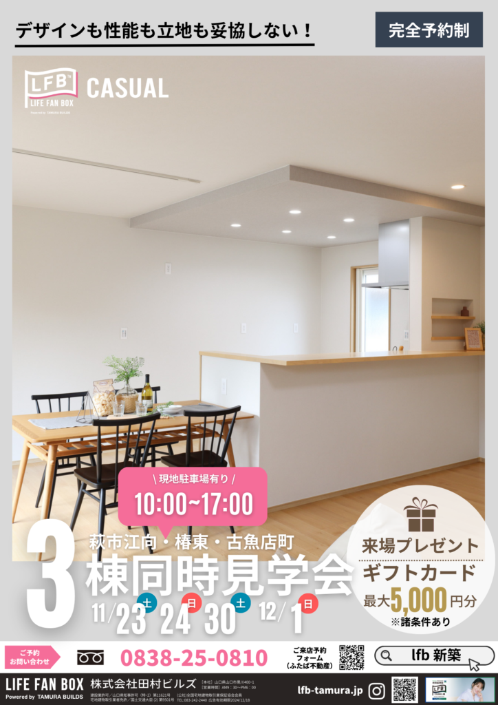 そのLFB新築住宅の平屋・2階建てを見比べることができる見学会を山口県萩市で開催します‼