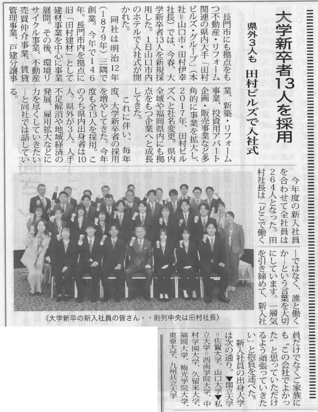 4月1日に執り行った当社の入社式が長門時事新聞に掲載されました。