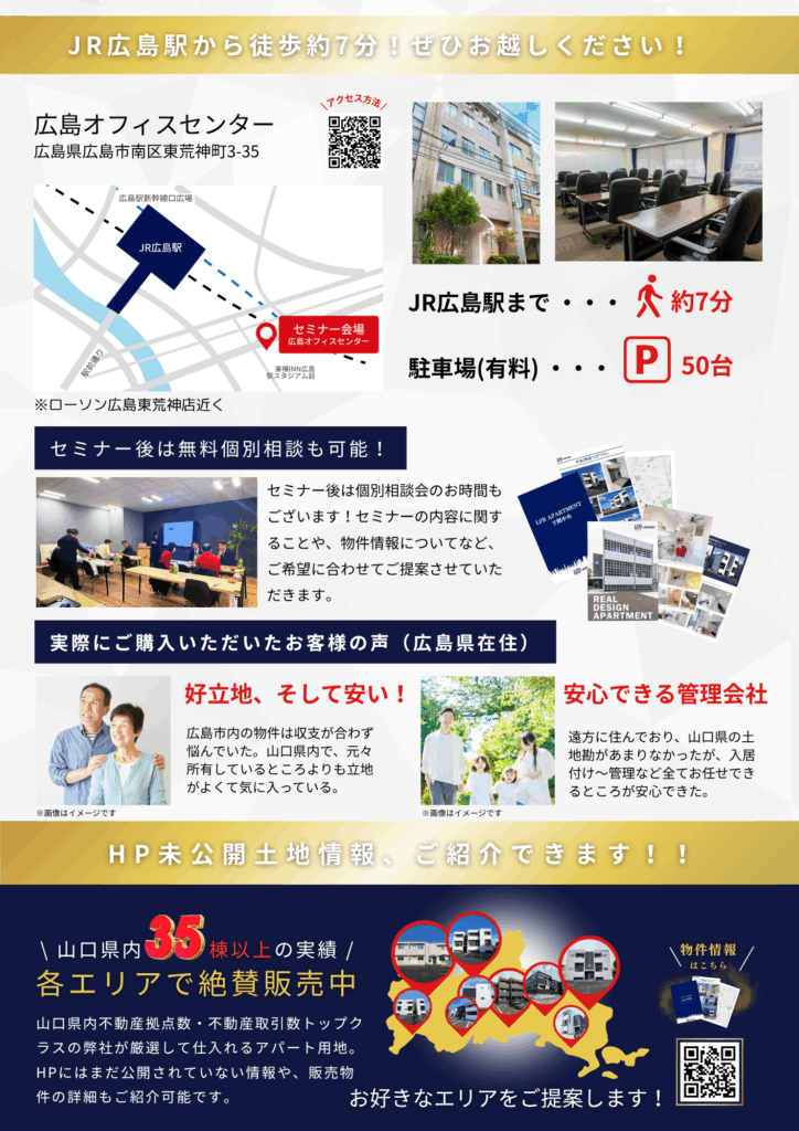 「利回り・都会=安定している」と判断してしまうのは要注意!本セミナーでは、失敗しないための物件選びポイントや弊社の仕入れる好立地情報について解説します。
