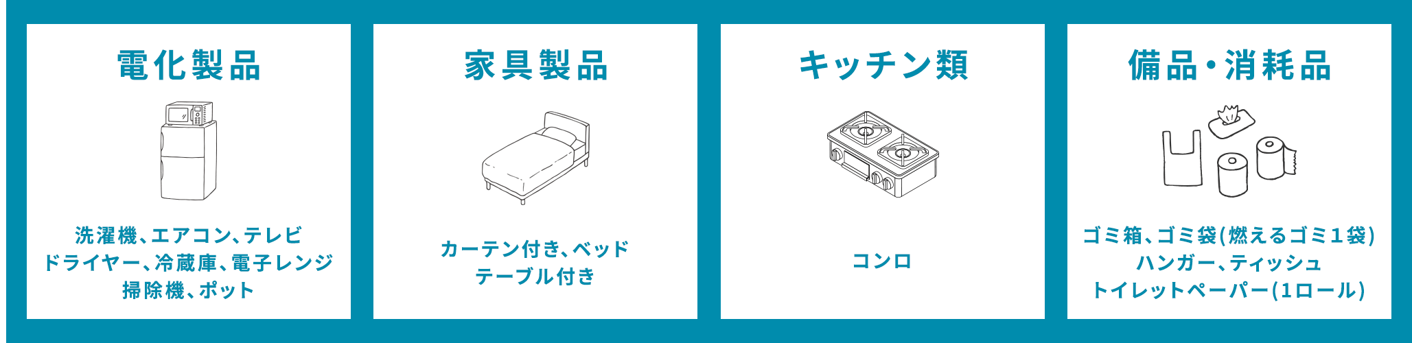 すぐに新生活をスタートできるよう、生活に必要な家具・家電を完備。出張・転勤・住み替えなど幅広いシーンに対応可能です。