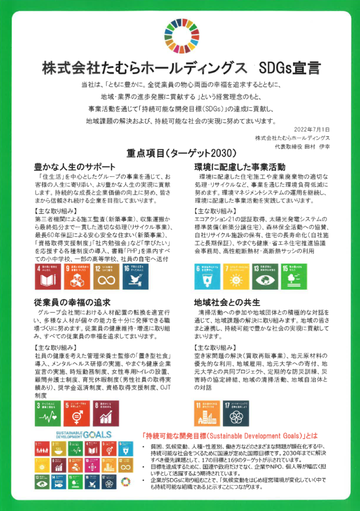 この度、株式会社山口銀行様が法人向けに提供している「SDGs経営立ち上げ支援サービス」を活用し、株式会社たむらホールディングスが『SDGs宣言』を策定して公表いたしました。