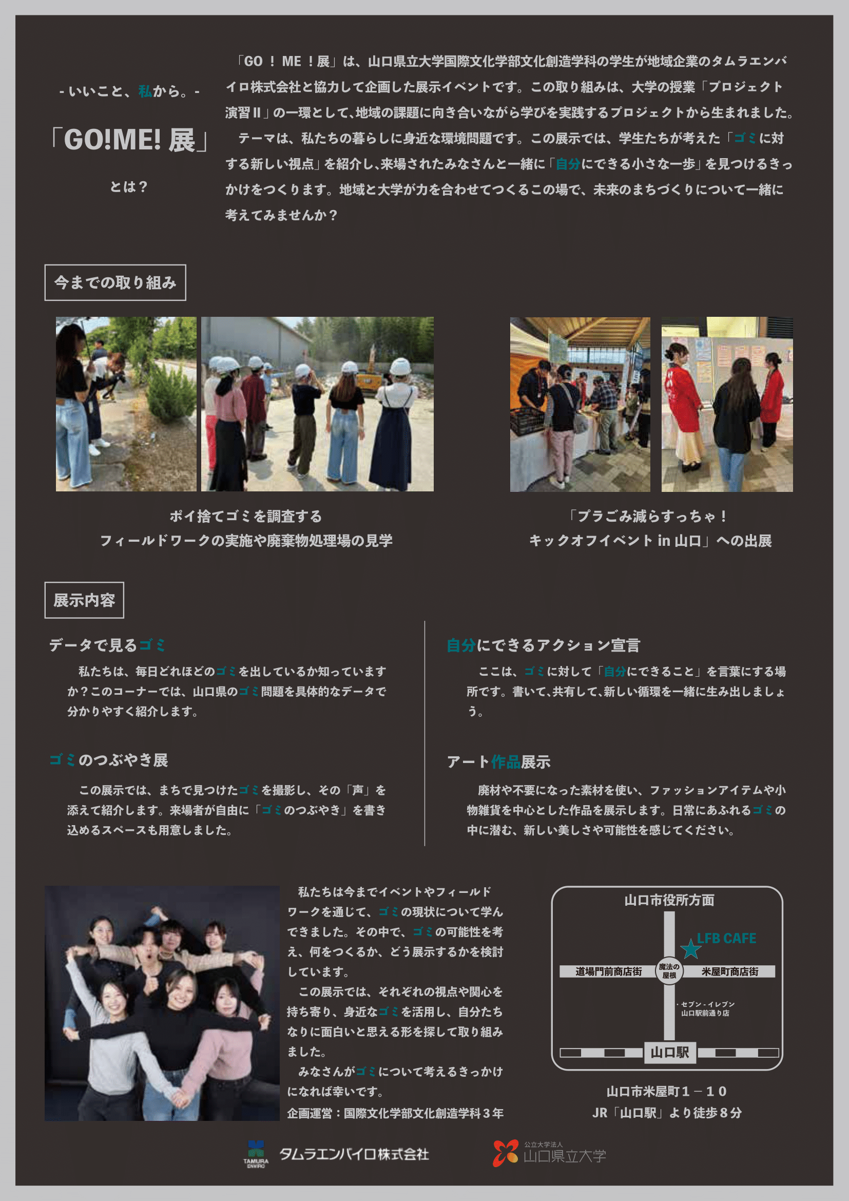 空き家を利活用して地域交流拠点を作り、地域を盛り上げるプロジェクトなどを進めていましたが、2025年度は「DXでまちをキレイに!社会課題のごみ問題を解決しよう」をテーマに、地域の環境美化と持続可能な街づくりのために、DXを活用したごみ投棄抑制活動に取り組んでいます。その活動の一環として取り組んできたプロジェクト成果を、展示イベント「GO!ME!展」として一般公開いたします。
