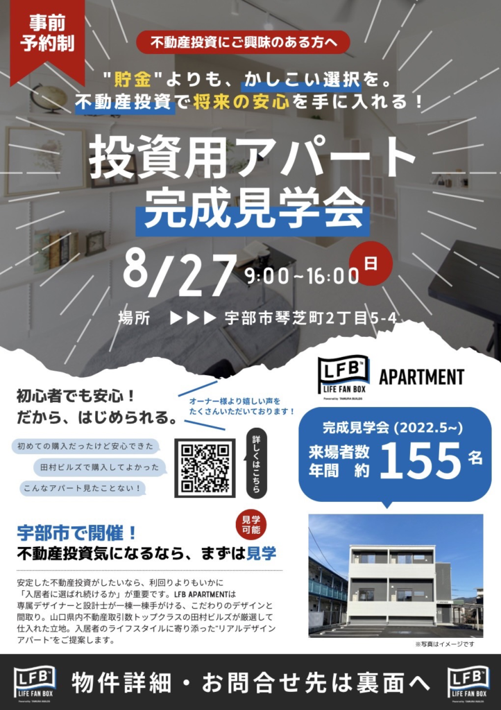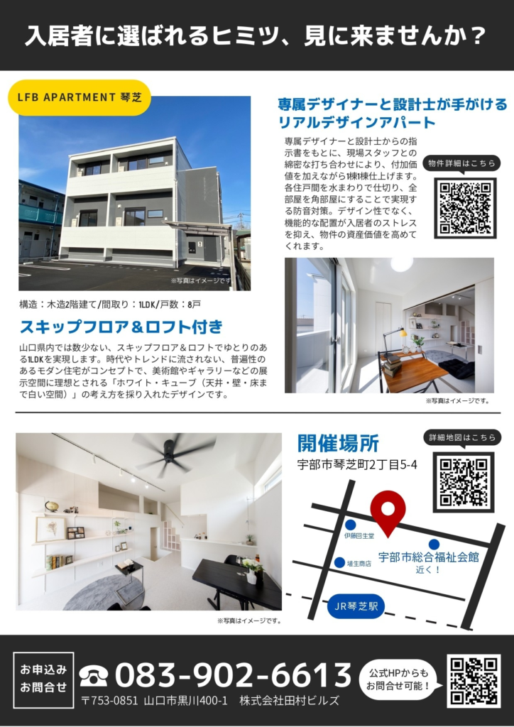 山口県宇部市で建築中の「LFB APARTMENT琴芝」の完成見学会のお知らせです♪