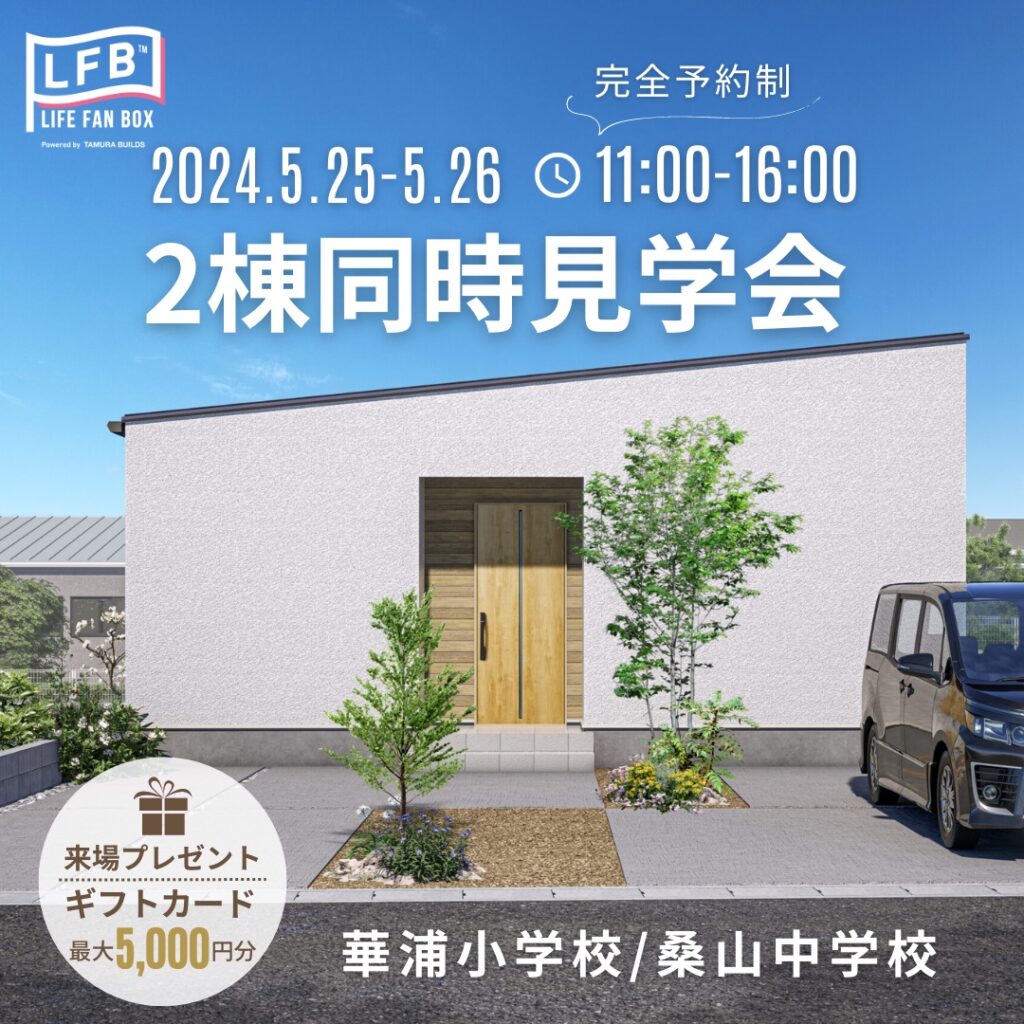 今週末、2棟同時見学会を開催します!人気の平屋とスタイリッシュなグレーの外観がおしゃれな2階建てです。