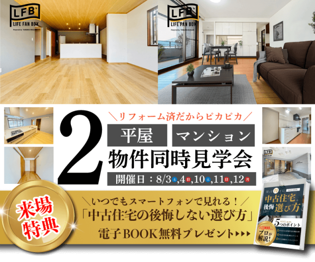 そのLFB再生住宅の平屋・マンション2物件同時見学会を山口県山口市で開催いたします。リフォーム済みなのでピカピカ!この機会に中古戸建と中古マンションを比較してみませんか?