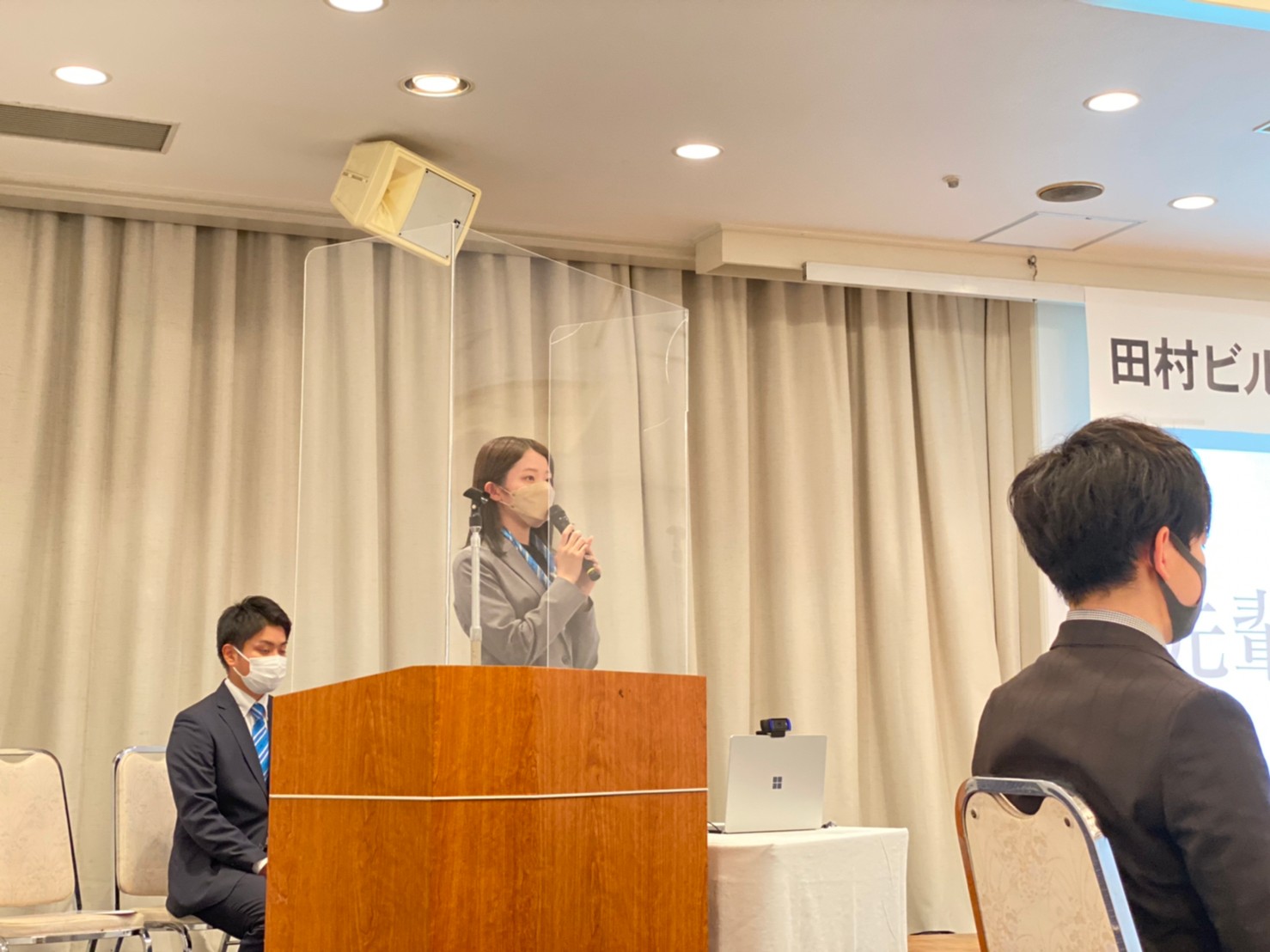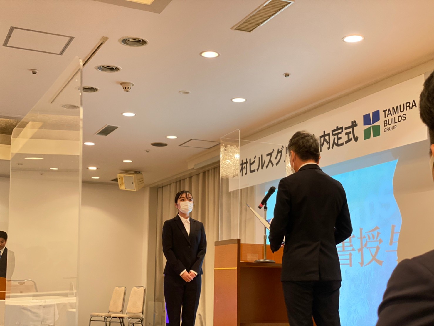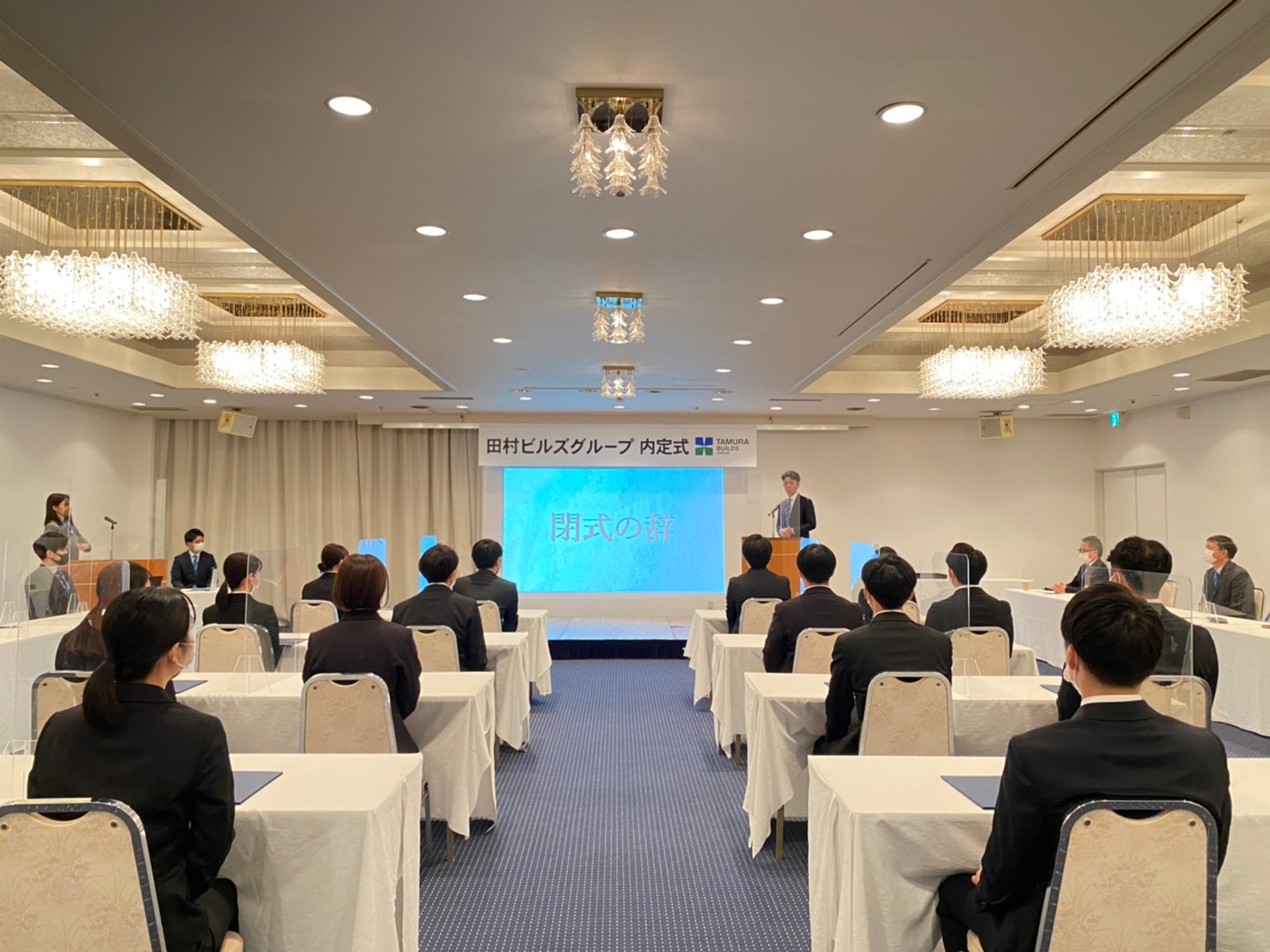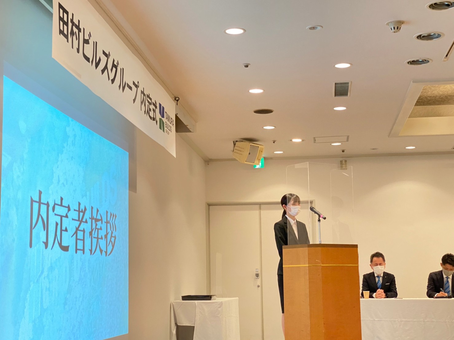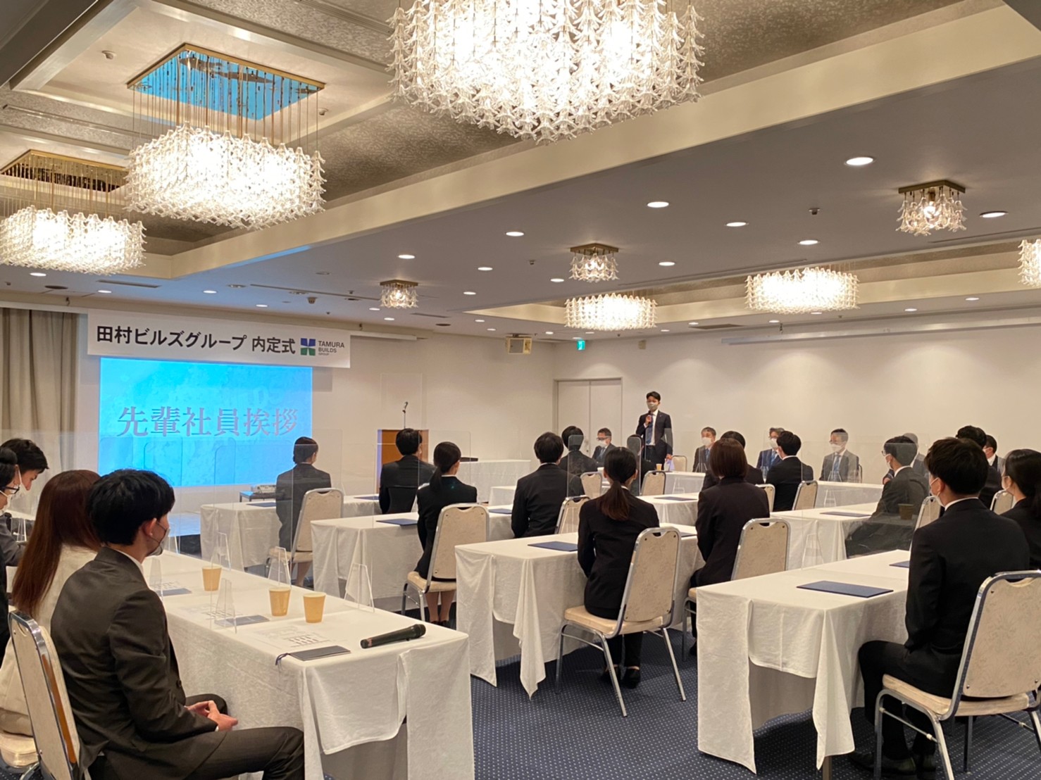 ▲内定者挨拶。ここでは「田村ビルズグループの◯◯といえば私」というテーマで、入社に向けて決意表明をしていただきました。これも初めての試みでしたが、堂々と各々の決意を言葉にしてくれて、思わずウルっとしました(採用チーム一同)