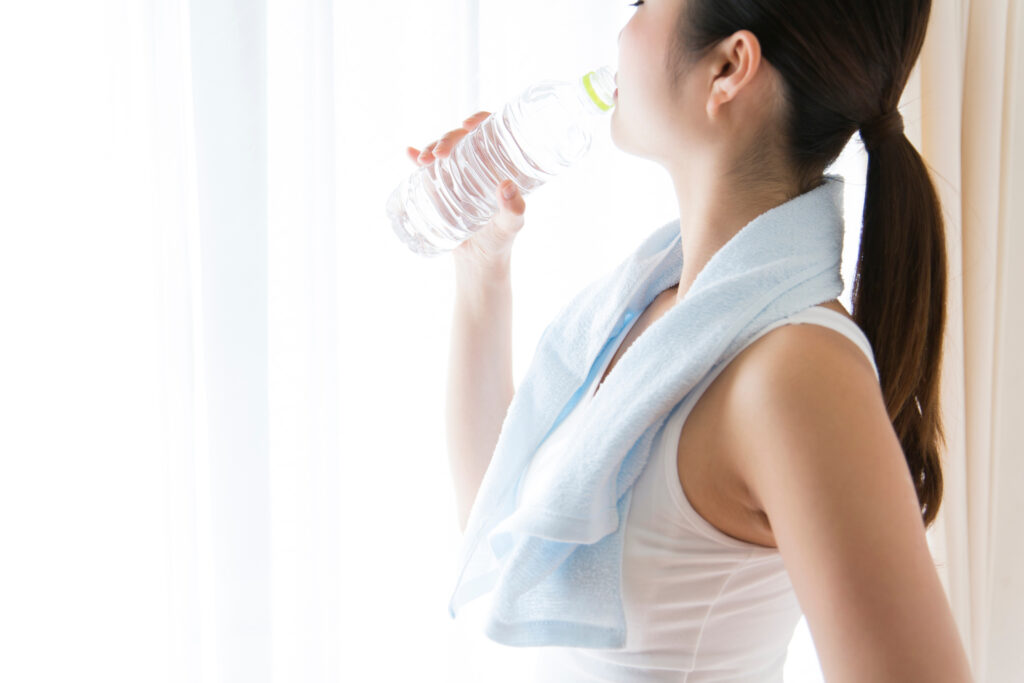 1時間に1回、コップ1杯を目安に。スポーツドリンクや塩分補給も忘れずに。