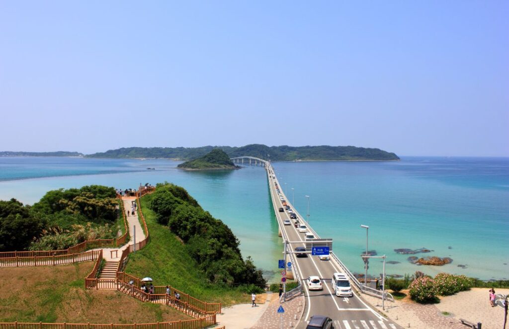 山口県屈指の絶景ロード「角島大橋」を自転車で駆け抜ける爽快感は、一度体験したらクセになる!レンタサイクルもあるけぇ、気軽に挑戦できるよ。美しいエメラルドグリーンの海を眺めながら、風を感じる旅に出かけてみらん?