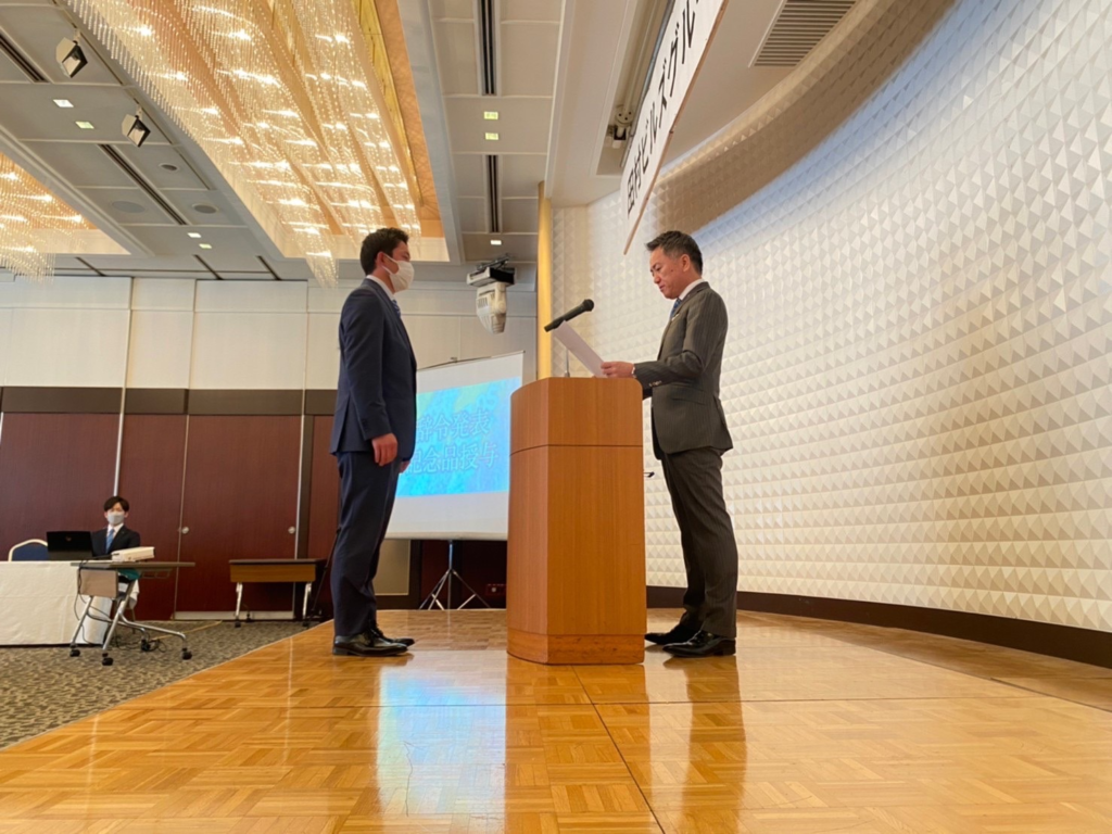 15名の新入社員が入場し、オープニング動画放映後、まずは田村ビルズグループ代表の田村より、これから共に歩んでいく仲間に向けたメッセージが送られました。その後、辞令発表と記念品の贈呈。15名一人ひとりにこれからの期待と熱意を込めて、田村社長より手渡しされました。