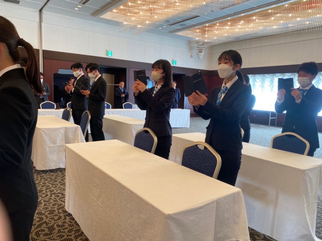 今年の入社式もYoutubeにてライブ配信させて頂きました。まだ大人数で集まることが躊躇される中で、式に参加できる社員も限られており、『全社員で入社式を一緒に迎えたい』、そんな思いでYouTubeライブ配信を始めました。ライブ配信をすることで、遠方にいらっしゃる新入社員のご家族にも入社式の様子をお届けできるのはとても嬉しいです。今年も生配信と同時に入社式がスタートしました。